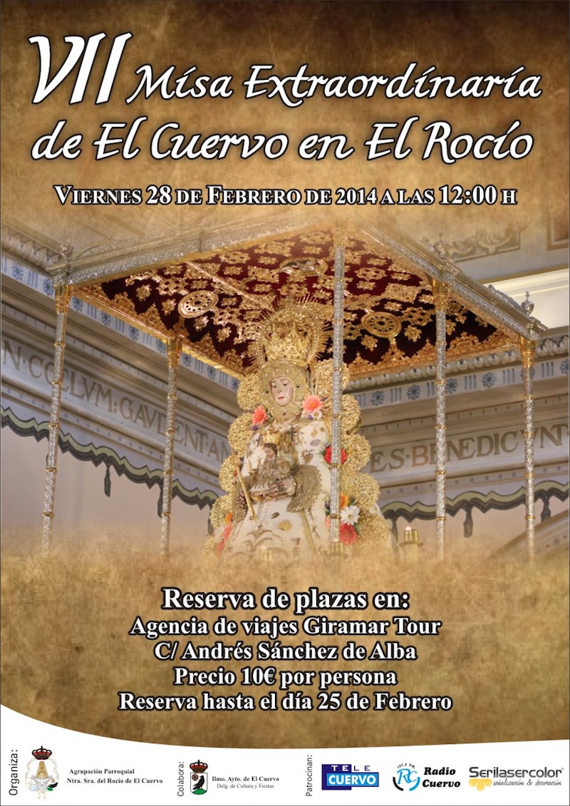 La Agrupación Parroquial de Ntra. Sra. del Rocío de El Cuervo, comienza los preparativos para la celebración de su séptima misa en la Ermita de la Stma. Virgen del Rocío para el próximo 28 de febrero. Dicha misa se celebrara a las 12:00 de la mañana conjuntamente con nuestra Hermandad Madrina de Lebrija. Aprovechamos la ocasión para invitar a toda la familia rociera a que acompañen a esta Agrupación en dicho día y en la convivencia que se celebrara una vez concluido el acto litúrgico.