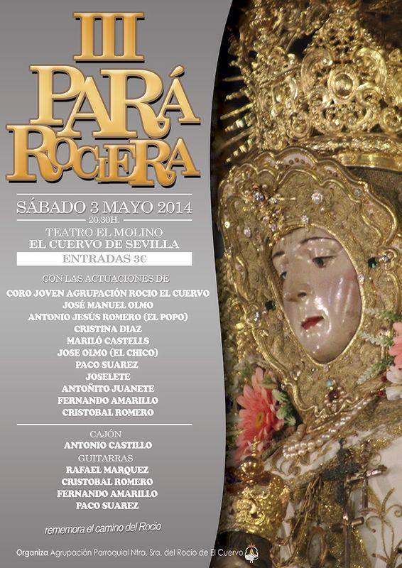 La agrupación Parroquia de Ntra. Sra. del Rocío de El Cuervo, organiza para el próximo sábado 3 de mayo la tercera edición de la Pará Rociera, este evento se celebrara en El Teatro El Molino de la localidad cuerveña y dará comienzo a las 20:30 horas. las entradas se pueden adquirir al precio de 3€ en la Casa pro Hermandad, sito en C/Herrería 7 del Polig Rodalabota o en las taquillas del teatro una hora antes del comienzo de la función. la agrupación anima a todos a asistir a este espectáculo que rememorara momentos del camino del pasado año con imágenes cedidas por la televisión local y Lebrija Tv, asi como del gran numero de artistas que participan y a los cuales tenemos que agradecer su implicación.