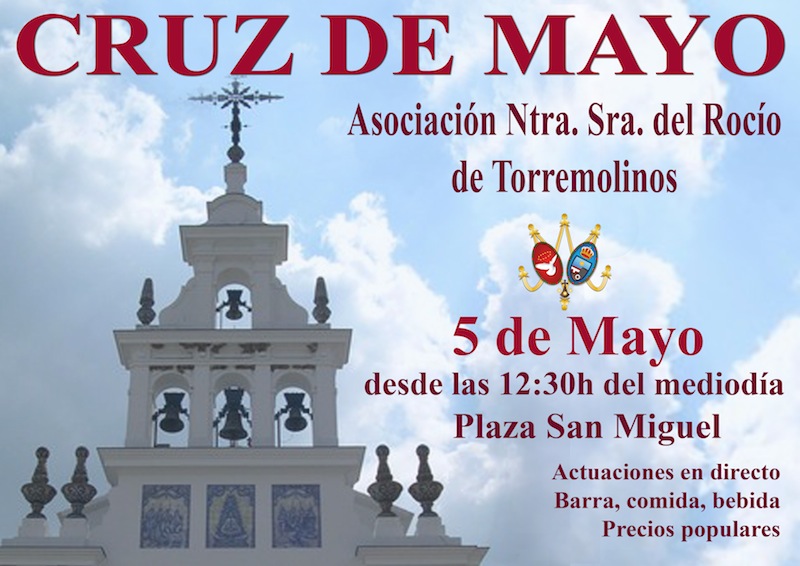 La Asociación Ntra. Sra. del Rocío de Torremolinos organiza el próximo sábado día 5 una Cruz de Mayo que dará comienzo al mediodía en la Plaza San Miguel de Torremolinos, junto a la iglesia del mismo nombre.