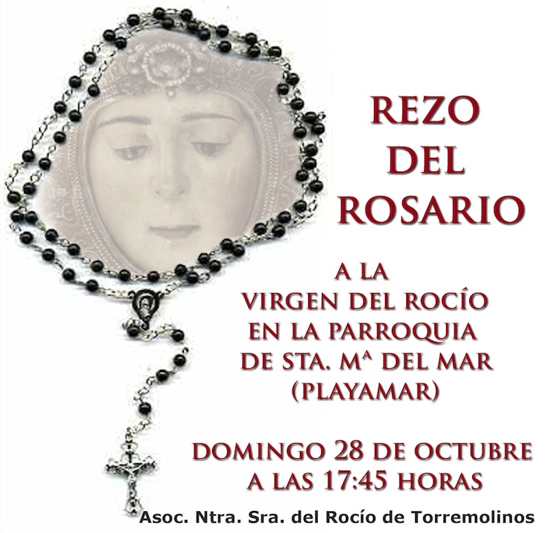 Con motivo del mes del Rosario, la Asociación Ntra. Sra. del Rocío de Torremolinos realizará el Rezo del Santo Rosario ante la imagen de la Virgen del Rocío que recibe culto en la Parroquia de Sta. Mª del Mar (Playamar, Torremolinos). El mismo se llevará a cabo el próximo domingo 28 de octubre a las 17:45 horas. Los misterios serán cantados por el Coro Rociero Alborada de la Asoc. Ntra. Sra. del Rocío de Torremolinos.