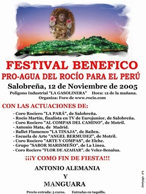 BOLETÍN EXTRAORDINARIO FESTIVAL BENÉFICO EN SALOBREÑA El día 12 de noviembre tendrá lugar en la bella localidad de Salobreña un Festival Benéfico para recaudar fondos para la ofrenda de este año a Ntra. Sra. la Virgen del Rocío: "AGUA DEL ROCÍO PARA PERÚ" leer más : http://www.rocio.com/boletin/boletin6.htm