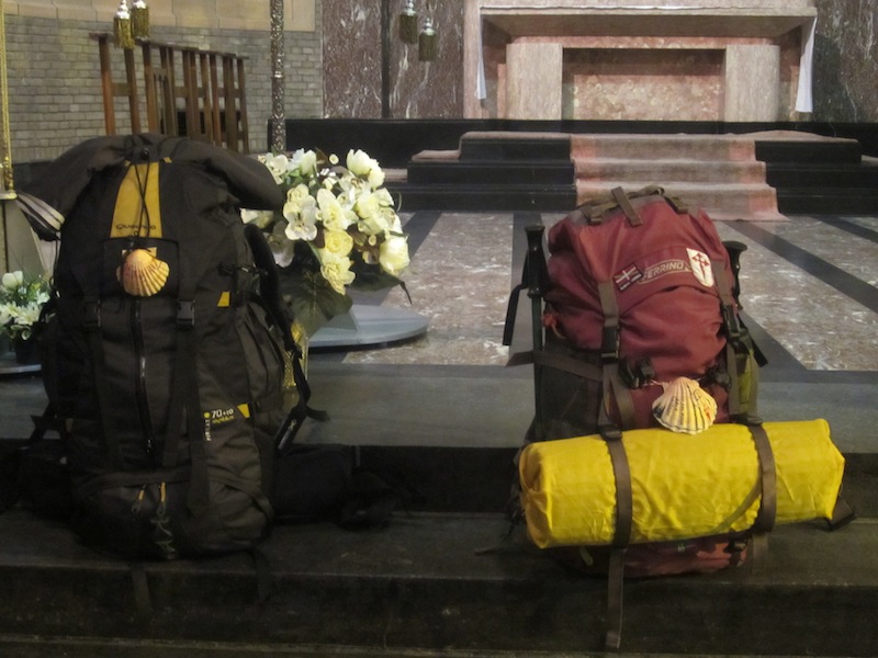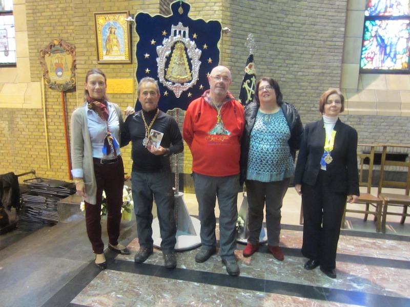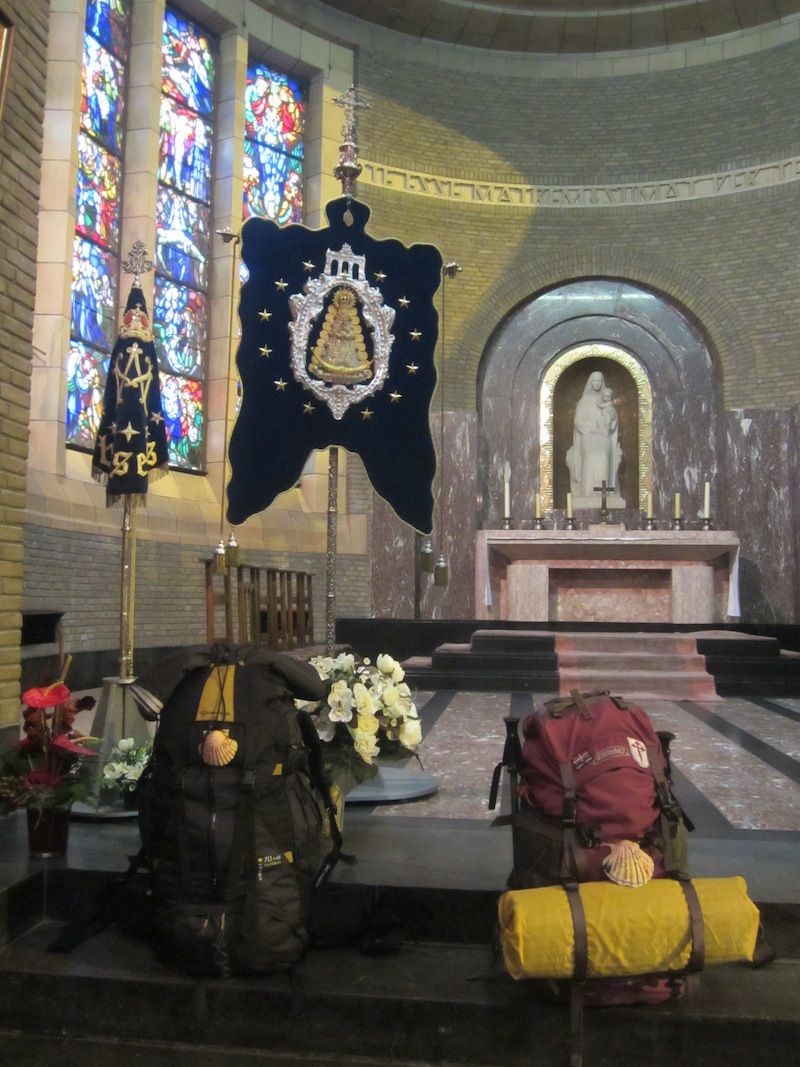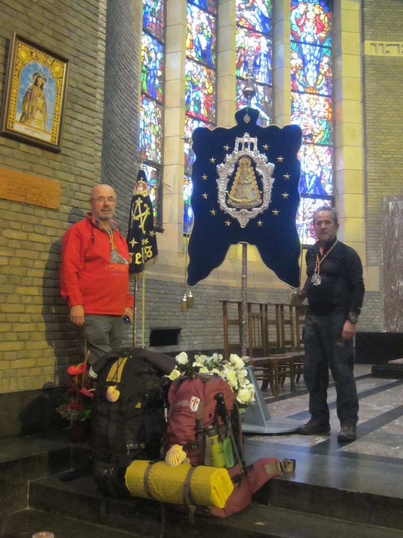 Esta mañana en la Basílica les acompañamos una representación de la Junta de Gobierno de la Hermandad del Rocio de Bruselas (Carmen, Pepi y yo misma) y aunque fue un acto muy íntimo, a esas horas en la Basílica no hay mucha gente, apenas algunos fieles que llegaban a la Eucaristía de las 9.00am, fue muy emotivo para todos los presentes. Jose Ignacio y Santi rezaron la bonita Salve del Peregrino que les protegerá durante las largas caminatas, y nosotras cantamos la Salve de la Hermandad, seguida de los VIVAS a la Virgen del Rocio, a la Blanca Paloma, a los Peregrinos, a la Hermandad Matriz y a la Hermandad de Bruselas.