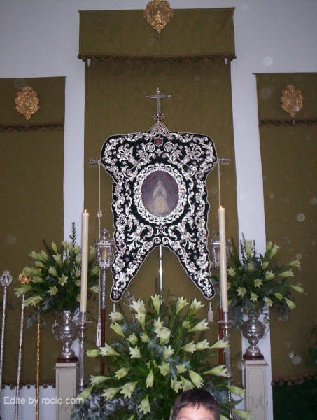 DOMINGO 29 de enero 2006. El Simpecado que llevará esta candelaria es el que lleva a la romeria actualmente, es de 1971, de Doña Esperanza Elena Carro. El Simpecado sera portado por una vara de 1916 donada por una devota es de plata rematada en cruz de gran elegancia sin ninguntipo de dibijo de orfebreria, al igual que la del gallardete de mayordomo o hermano mayor donada por la misma en el mismo año, todos los gallardetes de esta humilde hermandad llevan la misma leyenda " pilas a la virgen del rocio 1650". Igual que el camafeo que se le regalo hace ya 7 años , coincidiendo con el traslado a almonte y el 350 aniversario de la estampa mas antigua de la virgen que esta hermandad posee y que existe en la historia rociera, este es lucido por la santisima virgen a perpetuidad asi consta y se entrego a la hermandad Matriz de NUESTRA SEÑORA de Almonte en un acto hecho al efecto en su iglesia de la Asuncion, la antigua estampa de esta reproduccion es una parecida a la de Villamanrrique tomada de un lienzo del siglo XVI propiedad de Rocio Mateos Ortiz y que era propiedad de su marido natural de esta villa. El pileño Javier Anguas diseña o reproduce el ovalo actual que es una fiel reproduccion del ovalo de 1600 donde la virgen aparece sin rafagas y con la iconografia sin sufrir ningun cambio o trsformacion ocultada o venerada entre dos candelabros y un cortinaje que la resguarda de las inclemencias del tiempo. Javier Anguas colabora estrechamente con la matriz de Almonte , de sus obras tenemos el pañuelo de la virgen, la saya que estreno de pastora asi como numerosisimos atributos que restaura y trata en la actualidad.El junto con otro familiar seran los hermanos mayores de romeria 2006, y sera este su primer acto como hermanos mayores delante de la Virgen, la santa misa sera oficiada por el director espiritual Don FRANCISCO BERNAL y cantada por el coro de nuestra hermandad. desde PILAS A LA VIRGEN DEL ROCIO.
