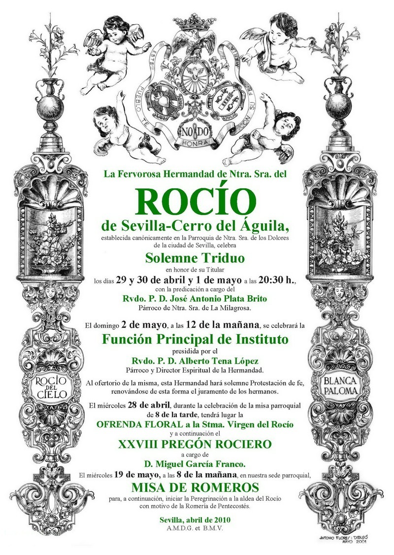 Los Cultos comienzan el miércoles 28 de abril (20.00 horas) con la Misa de Ofrenda Floral a la Stma. Virgen, seguida del XXVIII Pregón Rociero a cargo de Miguel García Franco.