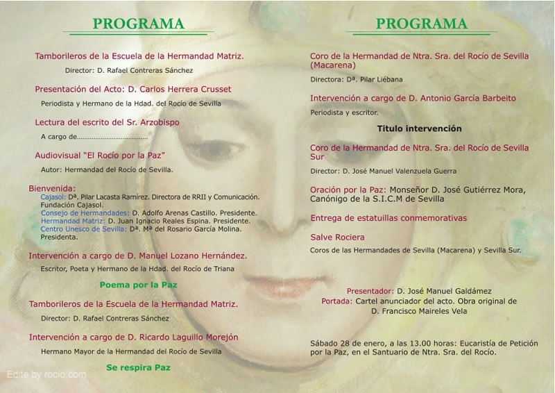 El miércoles 25 de enero, a las 20 h, se celebrará en Sevilla, en la Sala Joaquín Turina, del Centro Cultural Cajasol, el acto "El Rocío por la Paz", organizado porel Centro Unesco de Sevilla, conjuntamente con la Hermandad Matriz de Ntra. Sra. del Rocío de Almonte y con el Consejo de Hermandades y Cofradías de Sevilla. Así mismo colaboran en la iniciativa las cinco hermandades del Rocío de Sevilla, y la obra social de BANCA CIVICA-CAJASOL.