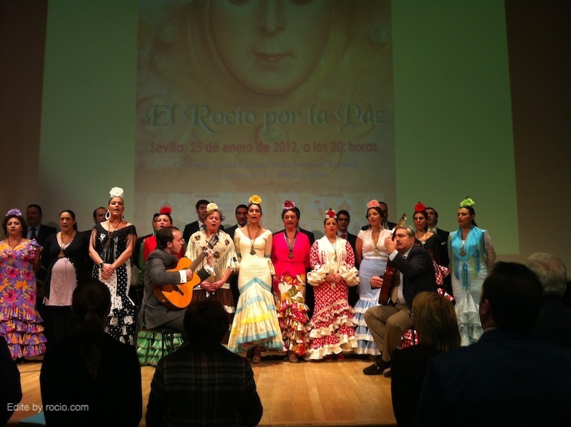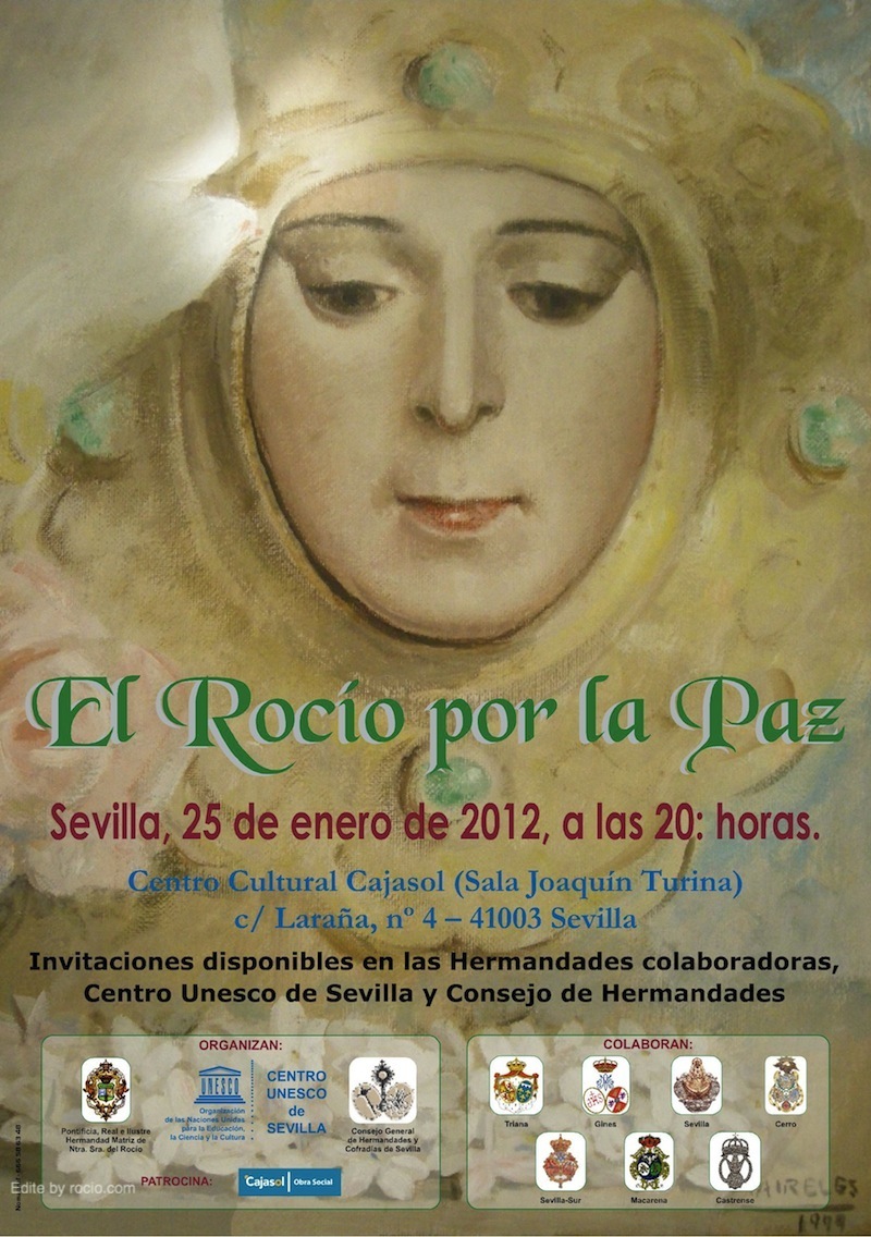 El miércoles 25 de enero, a las 20 h, se celebró en Sevilla, en la Sala Joaquín Turina, del Centro Cultural Cajasol, el acto "El Rocío por la Paz", organizado por el Centro Unesco de Sevilla, conjuntamente con la Hermandad Matriz de Ntra. Sra. del Rocío de Almonte y con el Consejo de Hermandades y Cofradías de Sevilla. Así mismo colaboran en la iniciativa las cinco hermandades del Rocío de Sevilla, la de Gines y la Castrense, y la obra social de BANCA CIVICA-CAJASOL.