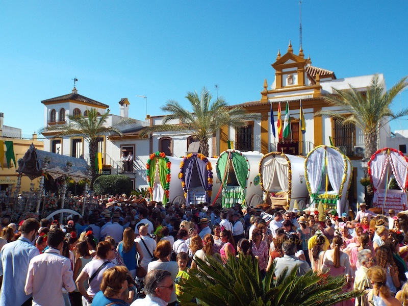 La Plaza de España y las calles más céntricas lucían especialmente engalanadas para la ocasión por parte del Ayuntamiento, que un año más volvió a volcarse con la gran fiesta del pueblo. En la plaza, las carretas de bueyes conformaban una de las imágenes más bellas y singulares de la jornada, esperando para emprender, junto al Simpecado un nuevo camino hacia el Rocío.