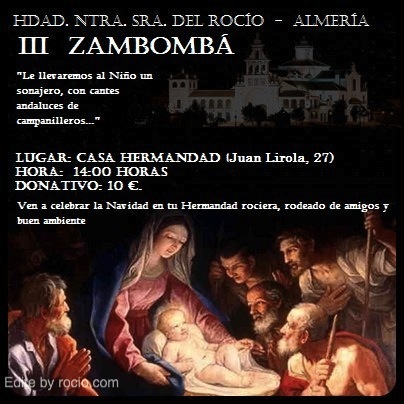 El Grupo Joven de la Hermandad de Nuestra Señora del Rocío de Almería organiza la «III ZAMBOMBA ROCIERA» Será el próximo Domingo 18 de Diciembre, a partir de las 14:00h, en la Casa de Hermandad (sita en C/Juan Lirola, 27- Almería)