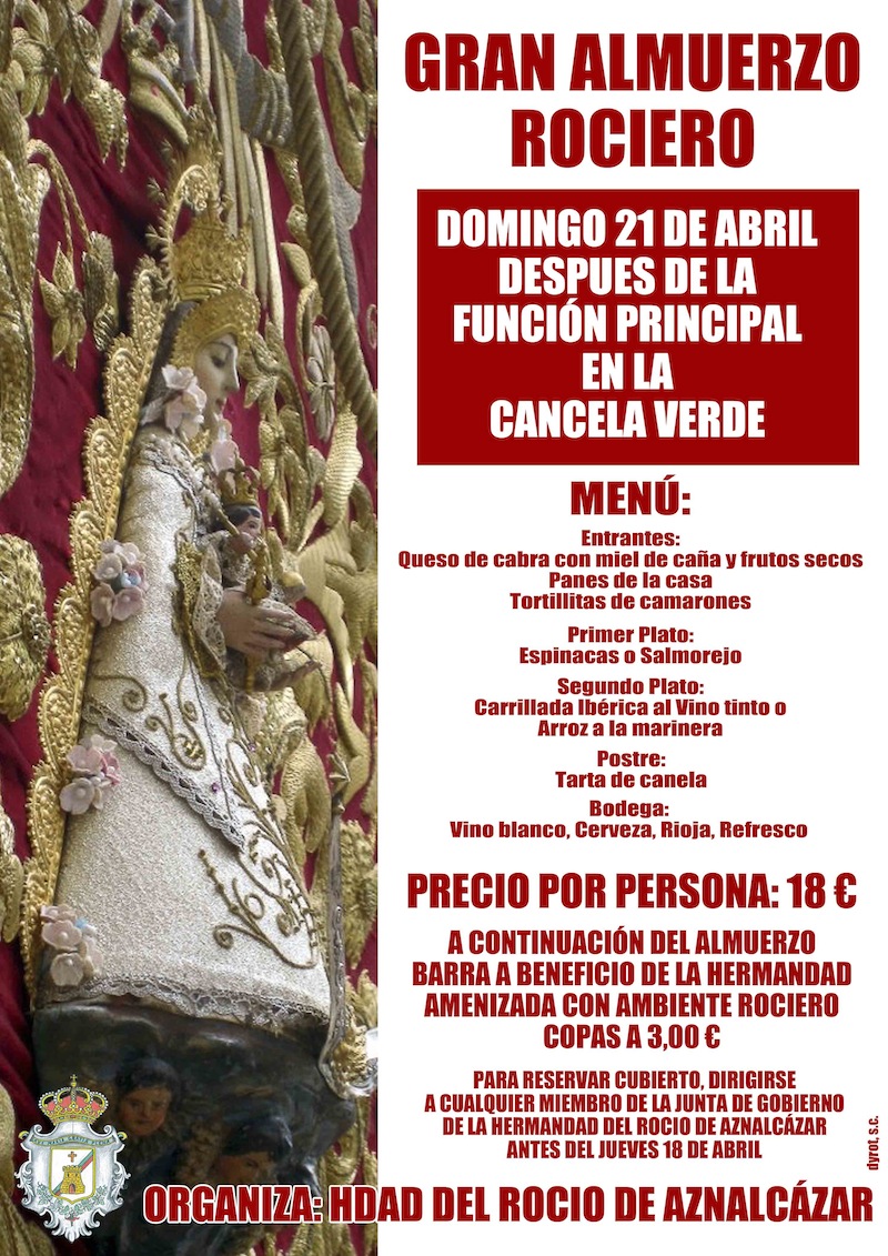 La Real, Ilustrísima y Muy Noble Hermandad de Nuestra Señora del Rocío de Aznalcázar Fundada en 1959 y establecida canónicamente en la Iglesia Parroquial de San Pablo, Patrón de la Villa, consagra en Honor Gloria de su Amantísima Titular MARÍA SANTÍSIMA DEL ROCÍO SOLEMNES CULTOS Días 17, 18 y 19 de Abril de 2013, a las 21:00 horas,