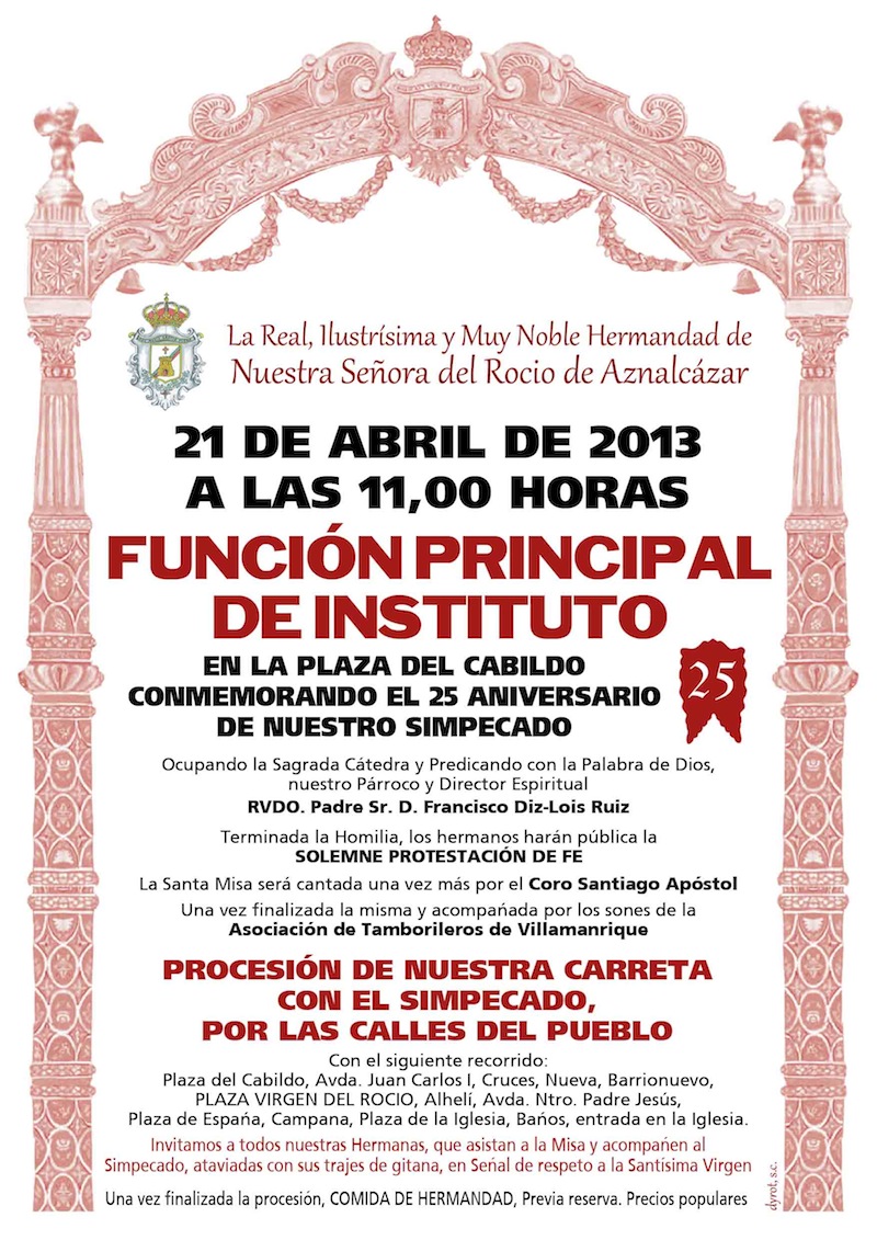 FUNCIÓN PRINCIPAL DE INSTITUTO En la PLAZA DEL CABILDO como Conmemoración del 25 Aniversario de la Bendición del Simpecado ocupando la Sagrada Cátedra nuestro párroco y Director Espiritual D. Francisco Diz-Lois Ruíz Terminada la Homilia, los hermanos harán pública la SOLEMNE PROTESTACIÓN DE FE La Santa Misa será cantada una vez más por el Coro Santiago Apóstol. Una vez finalizada la misma y acompañada por los sones de la Asoc. De Tamborileros de Villamanrique PROCESIÓN DE NUESTRA CARRERA CON EL SIMPECADO Con el siguiente recorrido: