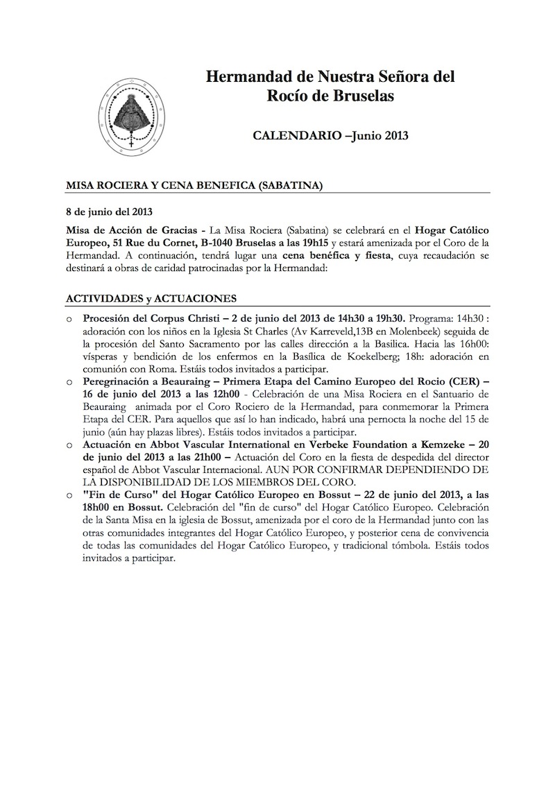 Estimados Hermanos y Simpatizantes rocieros. Ya se acercan las tan deseadas y merecidas vacaciones estivales, pero antes la Hermandad y su Coro Rociero van a tener un mes bastante cargadito de actividades como podeis ver en el documento que os adjunto. Estais todos invitados, por supuesto, a participar en estas actividades si asi lo deseais.
