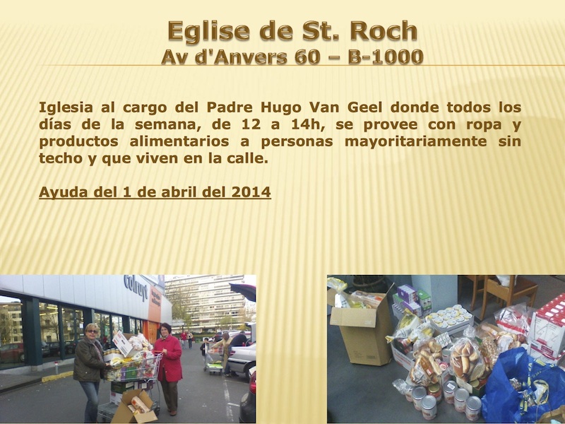 Adjunto os envío el dossier de la Bolsa de Caridad de la Hermandad del mes de Marzo 2014, para que podáis ver a qué proyecto hemos destinado fondos durante el mes. Un proyecto nuevo y muy bonito ya que ayudamos una vez más a personas que no tienen ningún recurso para comprar comida ni para vestir. Muchos de ellos casi ni pueden calentar la comida pues viven en la calle. Los alimentos y la ropa se dejan en la Iglesia de St Roch y ellos recogen lo que van necesitando.