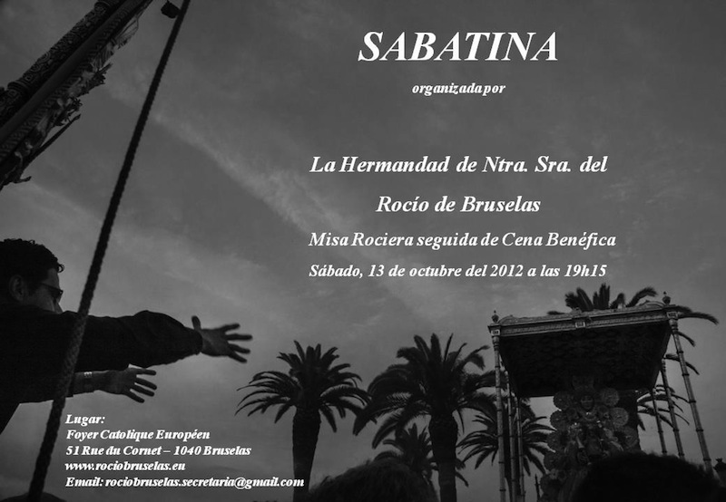 Después del éxito de la Sabatina pasada, la Hermandad ya está preparando la próxima Misa Rociera y Cena Benéfica, que tendrá lugar el próximo 13 de octubre en nuestra sede del Hogar Europeo Católico, rue du Cornet 51 en 1040 Bruselas, a partir de las 19h15, como es costumbre.