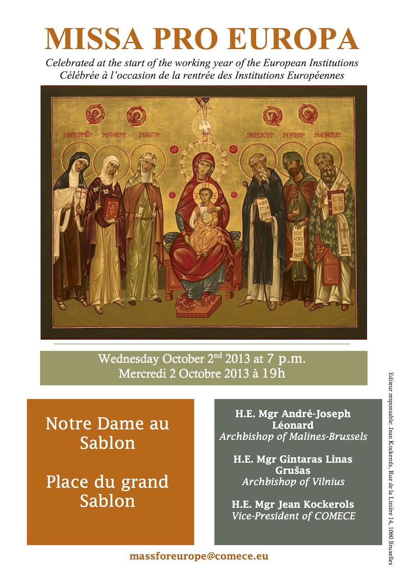 2 de octubre a las 19h00 – Misa “Pro Europa”– Eucaristía organizada por Mgr. Léonard, Arzobispo de Bruselas-Malinas junto con la Presidencia lituana de la Unión Europea, en la Iglesia de Notre Dame du Sablon (Bruselas). Estáis todos invitados a participar de la Eucaristía. La Hermandad estará representada por algunos hermanos.