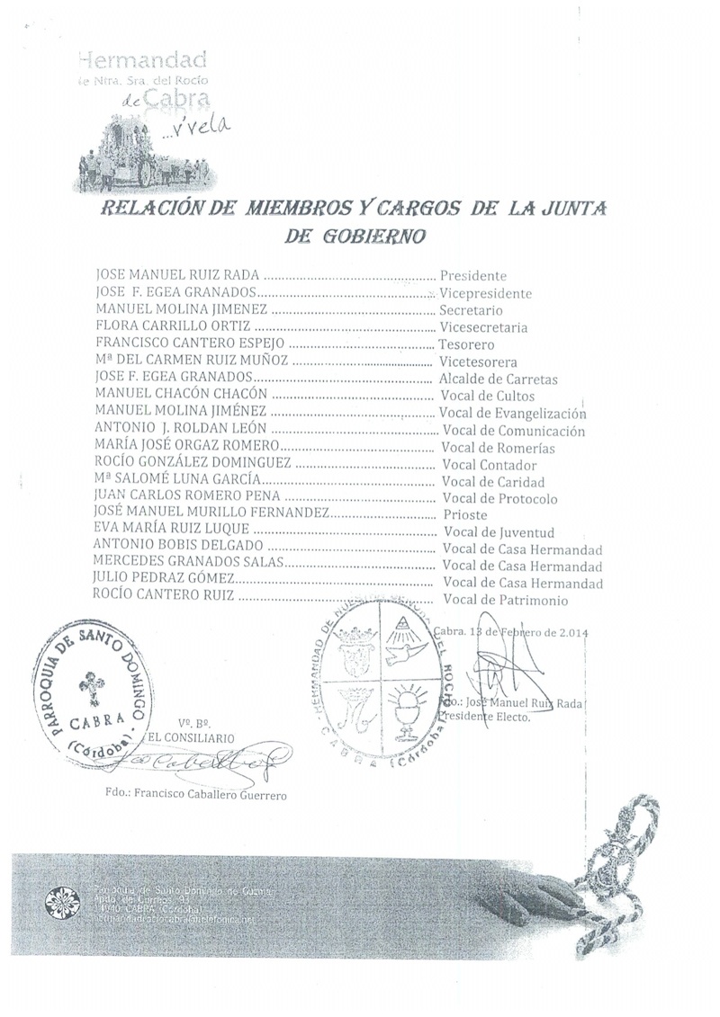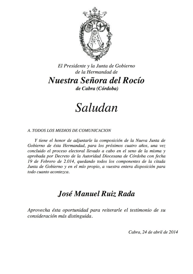 Saluda del nuevo presidente de la Hermandad Filial de Nuestra Señora del Rocío de Cabra (Córdoba), José Manuel Ruiz Rada, así como la composición de la Junta de Gobierno que le acompañará y copia de la ratificación diocesana del flamante órgano directivo que regirá nuestra Corporación durante los próximos cuatro años.
