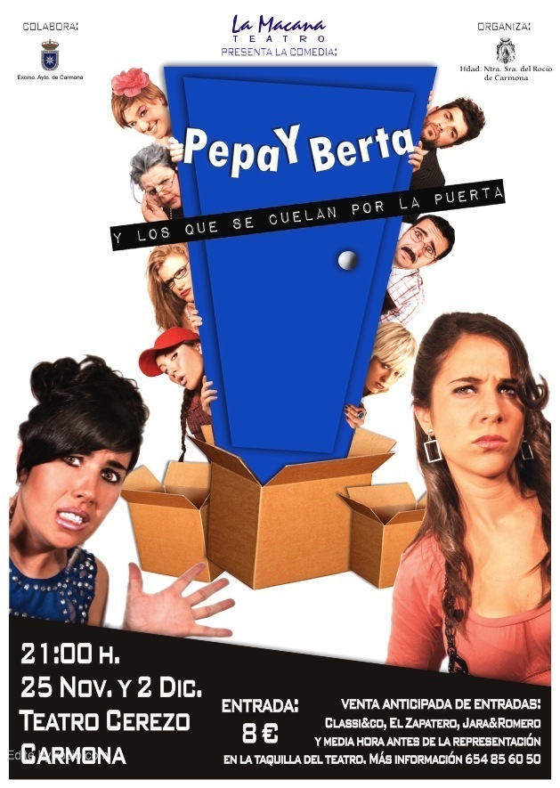 Te informo que este viernes 25 de Noviembre y el 2 de diciembre, en el Teatro Cerezo, y a beneficio de tu Hdad. Ntra. Sra. del Rocío, La Macana Teatro presenta la comedia, «Pepa y Berta y los que se cuelan por la puerta», esta obra ha cosechado multitud de premios como: