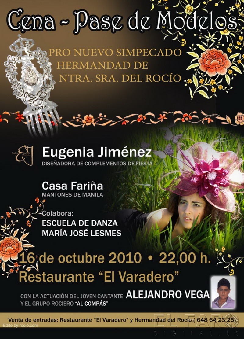 Lo explican desde la Hermandad: “Será un fabuloso espectáculo en el que participa la diseñadora sevillana Eugenia Jiménez, que expondrá por primera vez en Ceuta su nueva colección de tocados, pamelas y complementos 2011”. Para esta ocasión, será la Escuela de Danza de María José Lesmes, la encargada de pasar los tocados. “Durante la cena, en el restaurante El Varadero, habrá un segundo pase de modelos de mantones de manila, cedido por la Casa Fariña”, indican desde la hermandad. En este caso, cuentan, “las niñas de María José Lesmes, vestidas con batas de cola negras, pasarán los mantones y realizarán unos bailes de flamenco para los asistentes”.