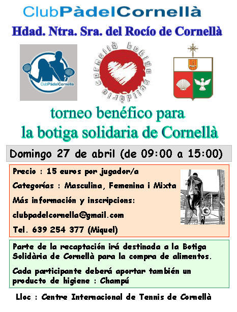 El próximo domingo 27 de Abril, con la ayuda del club de pádel de Cornellà, nuestra Hermandad dará apoyo a la organización del primer campeonato de pádel solidario organizado por la junta de gobierno actual.