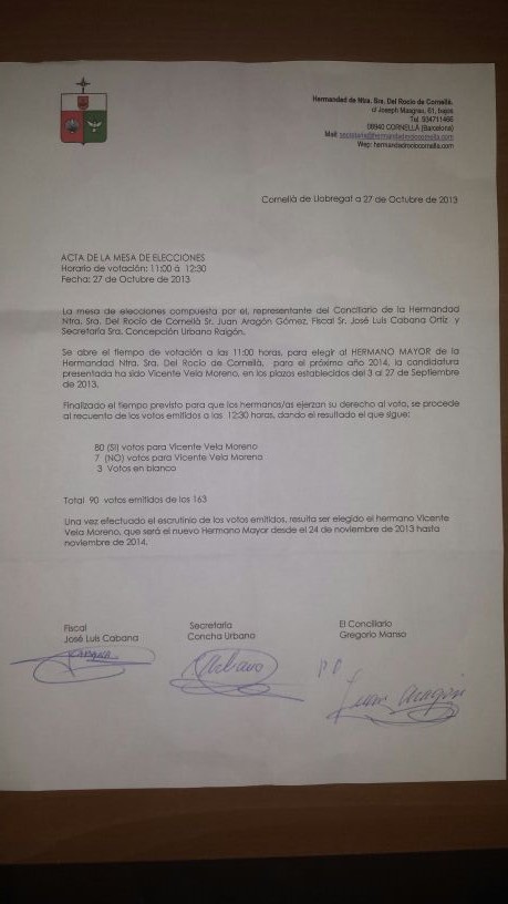 Adjuntamos unas fotos de Vicente, junto con la de hoy poco después de las votaciones junto con su hija Eli Vela y la carta de cierre de mesa electoral.