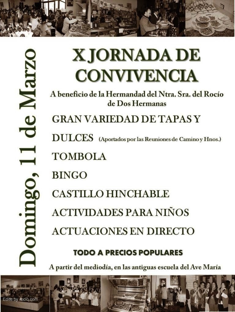 Las entradas estan a la venta a un precio de 6 € y se pueden adquirir en la Casa Hermandad, en la calle Alcoba nº 59 de lunes a viernes de 20:30 a 22:00 ó a través de cualquier miembro de la Junta de Gobierno, también se pueden adquirir en el propio establecimiento que las Hermanas Serrano poseen en la avenida de Andalucía de nuestra localidad. A continuación, en las antiguas escuelas del Ave María se celebrara la X Jornada de Convivencia. Donde podremos disfrutar de un ambiente de Hermandad, degustando tapas tradicionales y dulces caseros aportados por las reuniones de camino que acompaña al Simpecado de Ntra. Señora del Rocío en los días de romería, así como hermanos y devotos; todo a precios populares.