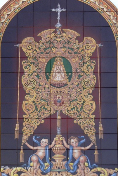 simpecado de dicha Hermandad y un conjunto de murales ceramicos alusivos a esta.
