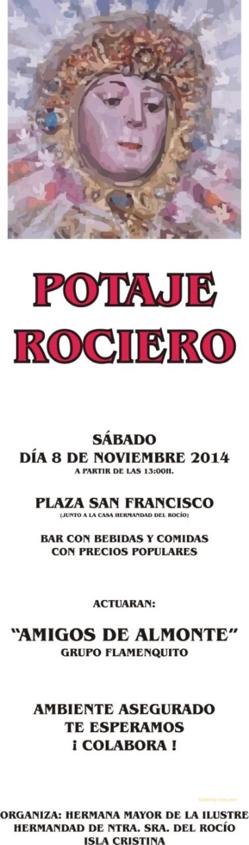 La Fervorosa e Ilustre Hermandad de Nuestra Señora del Rocío de Isla Cristina comunica que el próximo SÁBADO DÍA 08 DE NOVIEMBRE, a partir de las 13'00 horas, a las puertas de su Casa Hermandad en la Plazoleta de San Francisco, se celebrará un GRAN POTAJE ROCIERO, organizado por la Hermana Mayor para la Romería del 2015, Juana Rodríguez y en el que habrá una actuación especial.
