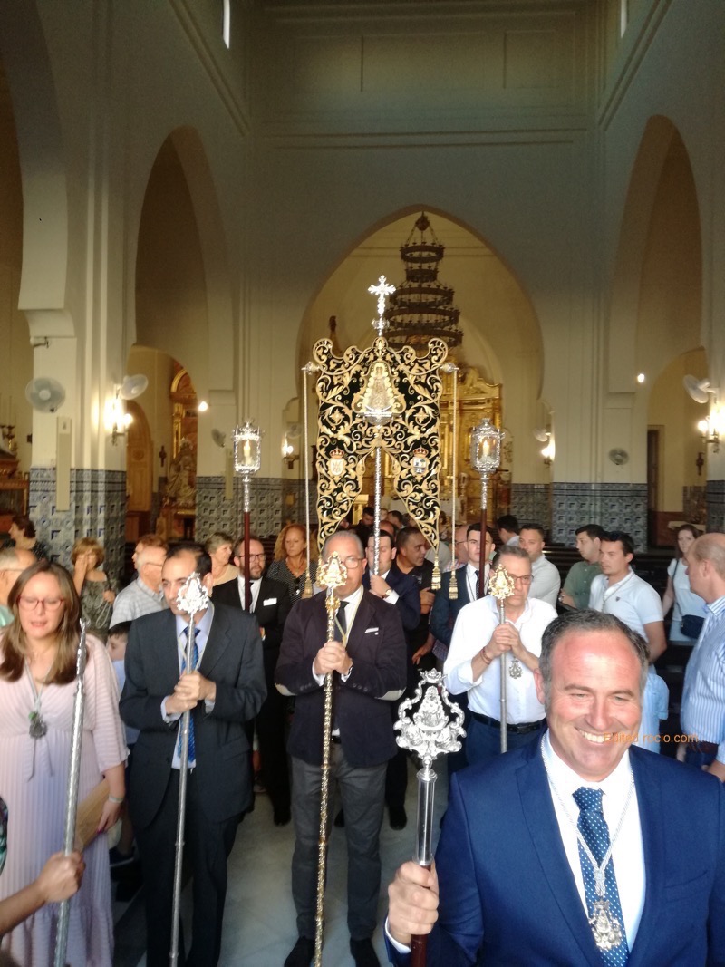 Por ello, un gran número de hermanos y hermanas de la Hermandad acompañaron al Simpecado en la Procesión del último viernes de mayo que lo llevaba desde la Parroquia de Los Dolores hasta la Casa Hermandad para entronizarlo en la Carreta.