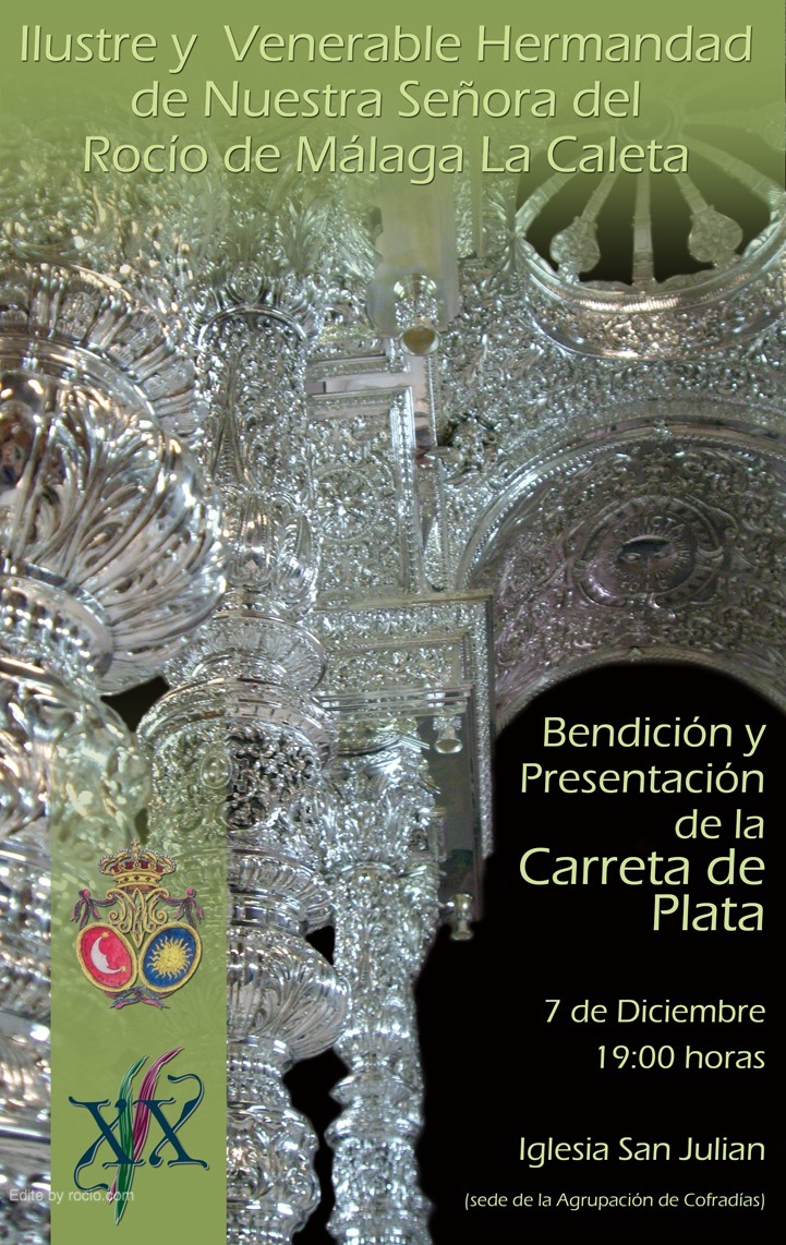 El próximo lunes 7 de diciembre, víspera de la festividad de la Inmaculada Concepción, a las 19.00 horas, se presentará en la iglesia de San Julián, sede de la Agrupación de Cofradía de Semana Santa de Málaga, la carreta que cobijará a nuestro bendito Simpecado realizada por los Talleres de Orfebrería Triana, según diseño del malagueño Jesús Castellanos Guerrero.