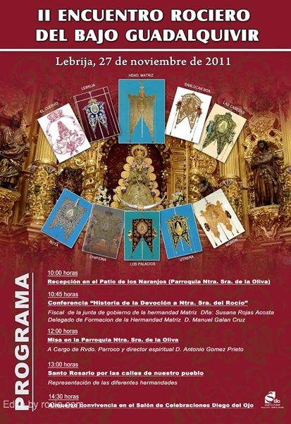La Hermandad del Rocío de Lebrija tiene el gusto y el honor de organizar este año el 2º Encuentro Rociero del Bajo Guadalquivir. Será el Domingo 27 de noviembre con la siguiente programación: