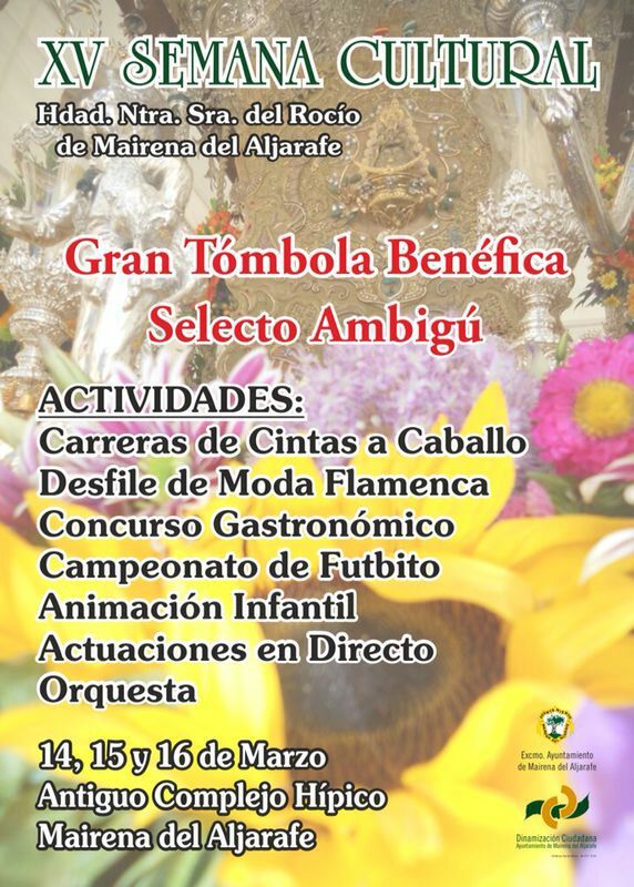 Como ya sabréis por las cartas enviadas, el próximo fin de Semana (días 14, 15 y 16) tendrá lugar nuestra XV SEMANA CULTURAL ROCIERA. Como todos los años tendremos una magnifica Tombola llena de regalos, y un Ambigú a precios populares.
