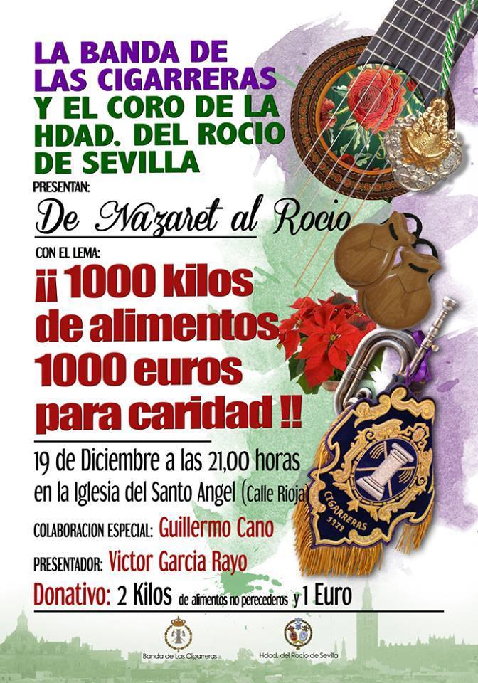 Se comunica que el próximo Jueves día 19 de Diciembre, a partir de las 21:00 horas y en la Iglesia del Santo Ángel (c/Rioja), el Coro de la Hdad. de Sevilla El Salvador y la Banda de Cornetas y Tambores de la Hermandad de "Las Cigarreras", ofrecerán el Concierto denominado, "De Nazaret al Rocío", a beneficio del Banco de Alimentos de nuestra Capital.