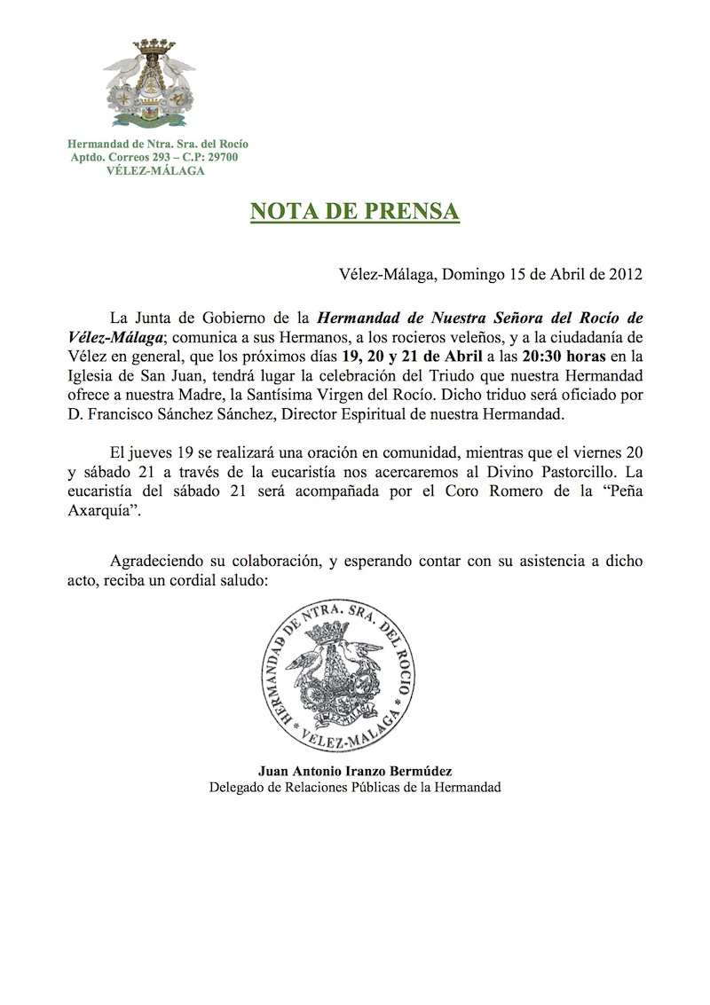 La Hermandad de Nuestra Señora del Rocío de Vélez-Málaga, celebra Solemne Triduo que se realizará a nuestra Madre, la Santísima Virgen del Rocío, los próximos 19, 20 y 21 de Abril.