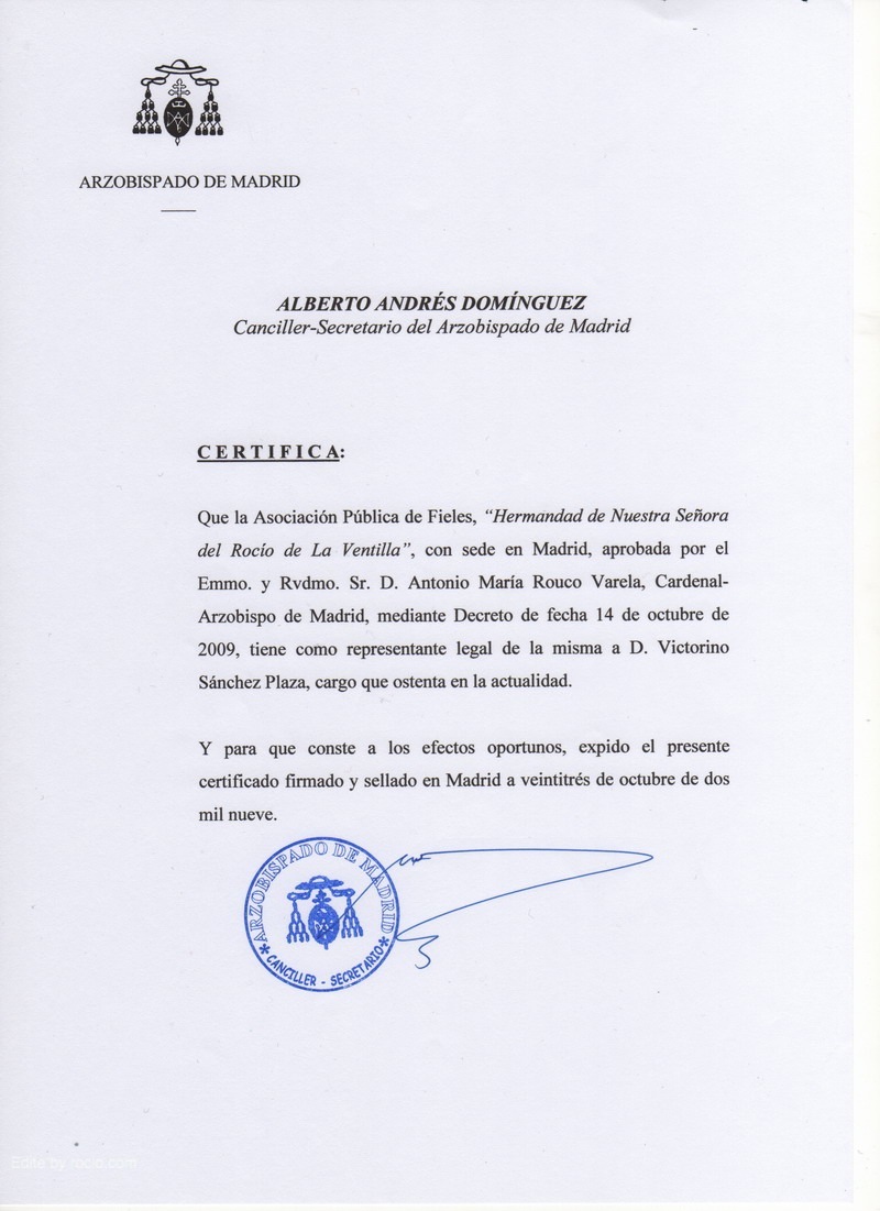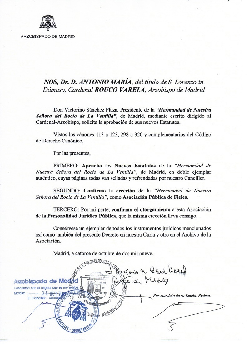 nuestro nombramiento como Hermandad, firmado por el Sr. Cardenal D. ANTONIO MARÍA ROUCO VARELA, así como la CERTIFICACIÓN del Sr. Canciller, D. ALBERTO ANDRÉS DOMINGUEZ, y Sr. Vicario General D. JOAQUÍN INIESTA CALVO-ZATARÁIN.