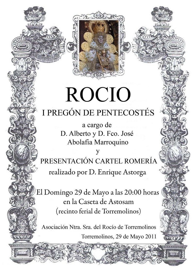 El próximo domingo 29 de Mayo a las 20:00 horas en la Caseta de Astosam tendrá lugar el Primer Pregón de Pentecostés 2011 que organiza la Asociación Ntra. Sra. del Rocío de Torremolinos por vez primera, y la presentación del Cartel de Romería para este año.