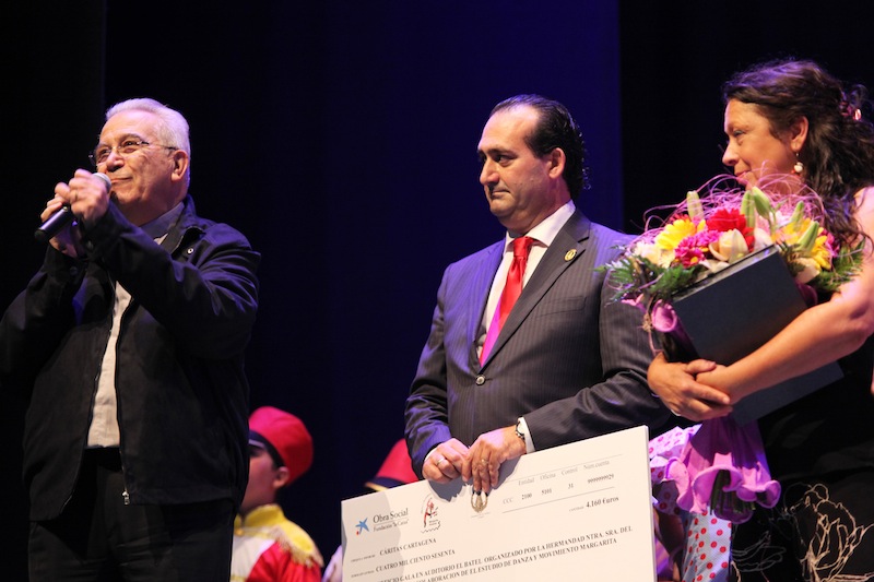 A la gala asistio el director de caritas D..Francisco Montesinos quien recibio de manos de Salvador Garcia ,presidente de la Hermandad de Ntra. Sra. del Rocío de Cartagena y D. Antonio Jose Abellan director espiritual de la misma el importe recaudado, que fue superior a los 4000 euros,