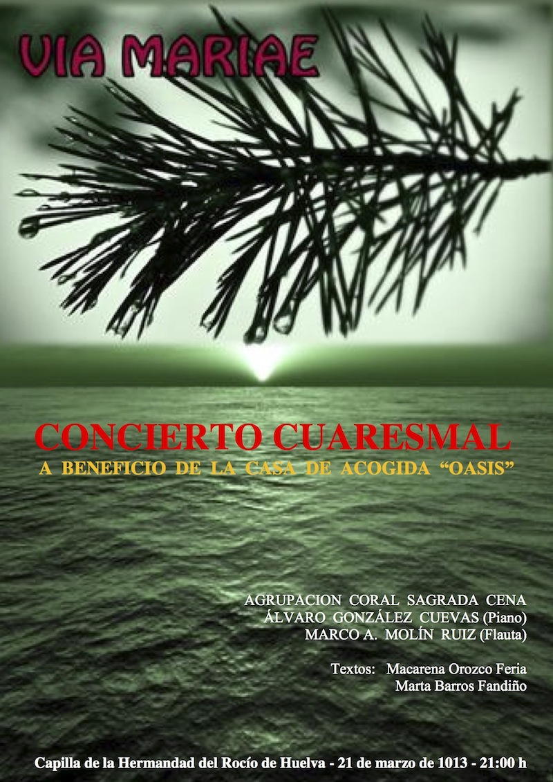 Alrededor de 30 personas pertenecientes a la Hermandad de la Sagrada Cena de Huelva, participaran en este concierto donde escucharemos, de forma narrada, la pasión y muerte de Jesús desde el punto de vista de su madre, Maria. La coral de dicha Hermandad de penitencia y el dúo de piano y flauta de Álvaro González y Marco A. Molin, le pondrán música a este Via Crucis Mariano.