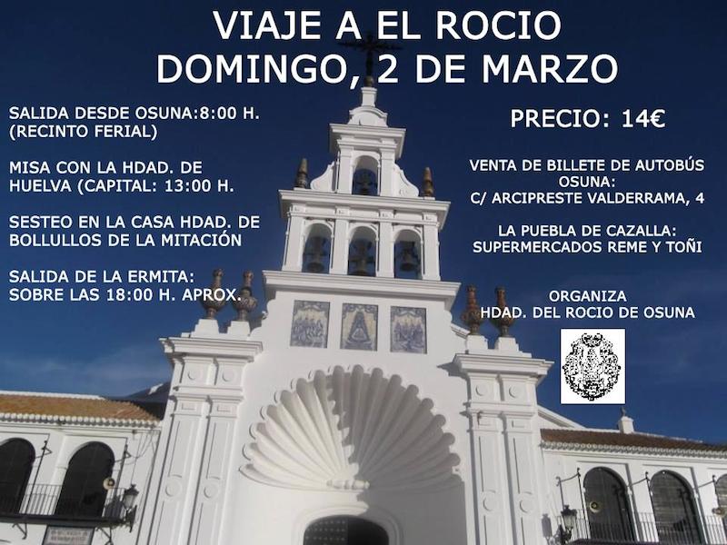 Como cada año, el primer fin de semana de Marzo, la Hermandad Mariana de Ntra. Sra. del Rocío de Osuna vuelve a organizar un viaje a la Aldea Almonteña para visitar a la Blanca Paloma en su Santuario.