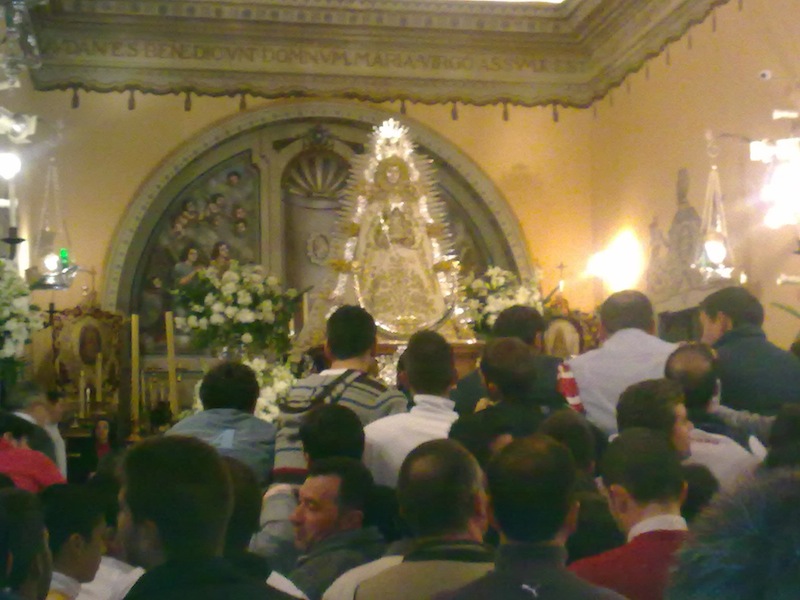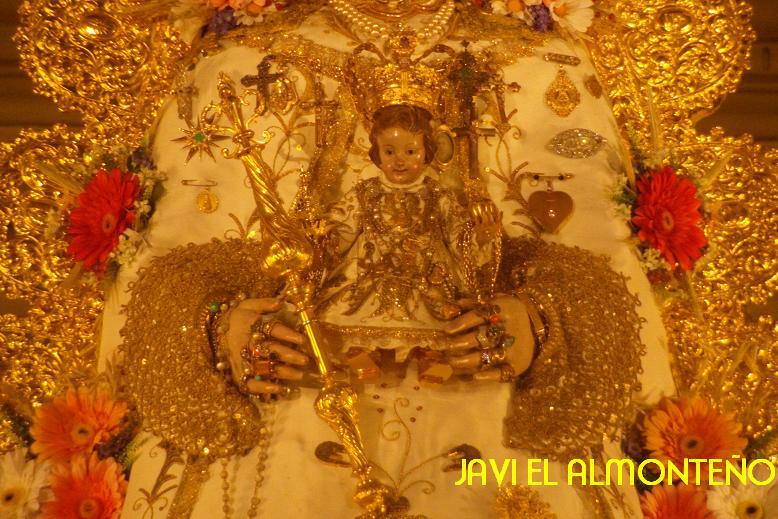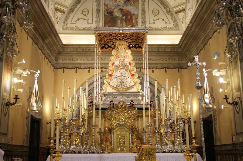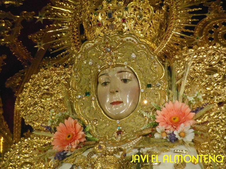 La Señora es trasladada al paso de Plata. Ya se envuentra Ntra. Sra. la Virgen del Rocío en su paso de plata tras ser vestida por las Hermanas Camaristas con el traje que donó en 1961 Don Ignacio Cepeda, diseñado por Don Joaquín Castilla, a juego con el manto de los Apóstoles.