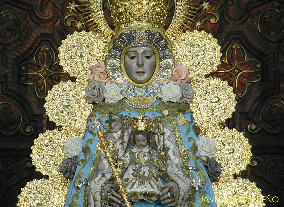 La Virgen del Rocío, luce en su saya -brazo derecho- el Lazo de platino y brillantes que el Foro del Rocío le regaló en el año 2003
