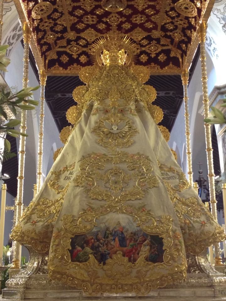Acoge una paloma que simboliza el Espíritu Santo, la medalla de la Hermandad Matriz y un misterio de Pentecostés que remata el conjunto, en los dos ejes colaterales, aparecen sendas cartelas, una con el lema "MADRE DE DIOS", y en la otra "PATRONA DE ALMONTE". "El conjunto está realizado con bordados de oro fino, plata y sedas sobre tejido de tisú de plata. la obra consta de los siguientes elementos: Saya, pecherín, cuello, mangas, sobre mangas, puños, túnica del Niño, toca sobre manto y manto. El tejido de tisú es de excelente calidad, realizado expresamnete para este trabajo, y se han empleado una pieza de 18 metros de largo por un metro de anchura. Incluye además, 18 cabezas de querubines y la saya dos, realizados todos en madera policromada y estofada, obra del escultor trianero José Antonio Navarro Arteaga". (Notas históricas sobre la Devoción a la Virgen del Rocío de Juan Ignacio Reales)