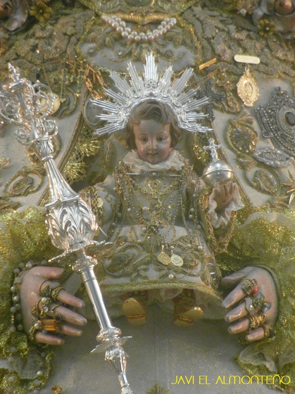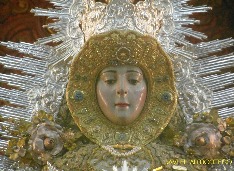 Hoy ha amanecido la Virgen del Rocío en su santuario con las galas de reina en su peana de Plata, sin palio, ostentando las Ráfagas de Rayos Biselados del Siglo XIX, junto a la Corona, Resplandor y media Luna de finales del XVIII. Lleva puesto el llamado traje de los Montpensiers, que erróneamente se les adjudica a los Condes de Paris del 1919, este traje es anterior, se representa en diversas pinturas y grabados de la segunda mitad del XIX, el primero de ellos de 1852. También encontramos fotografías de 1917, la Virgen en procesión con dicho traje, “anterior a 1919”, año que lo llevaba puesto cuando fue Coronada Canónicamente. La adjudicación de este Traje a los Montpensier según los investigadores seria primero por la flor de Lis, símbolo asociado a los Duques de Montpensiers, y la visita de estos en el 1851, que dejo importantes donaciones a la ermita como a algunas hermandades filiales. Lo que sí parece claro que data de mediados del siglo XIX.