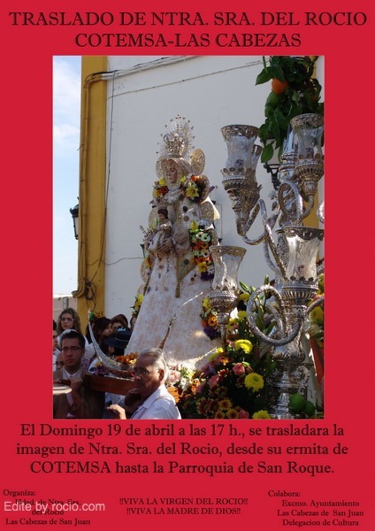 El próximo domingo 19 de abril, la Hermandad del Rocío de Las Cabezas de San Juan, trasladará la imagen de la Santisima Virgen del Rocio,desde su ermita de Cotemsa hasta el pueblo de Las Cabezas, justamente a la Parroquia de San Roque (sede canónica de la hermandad), para recibir culto junto a nuestro bendito simpecado, adjunto remito el cartel con la información del evento y una foto de la Virgen