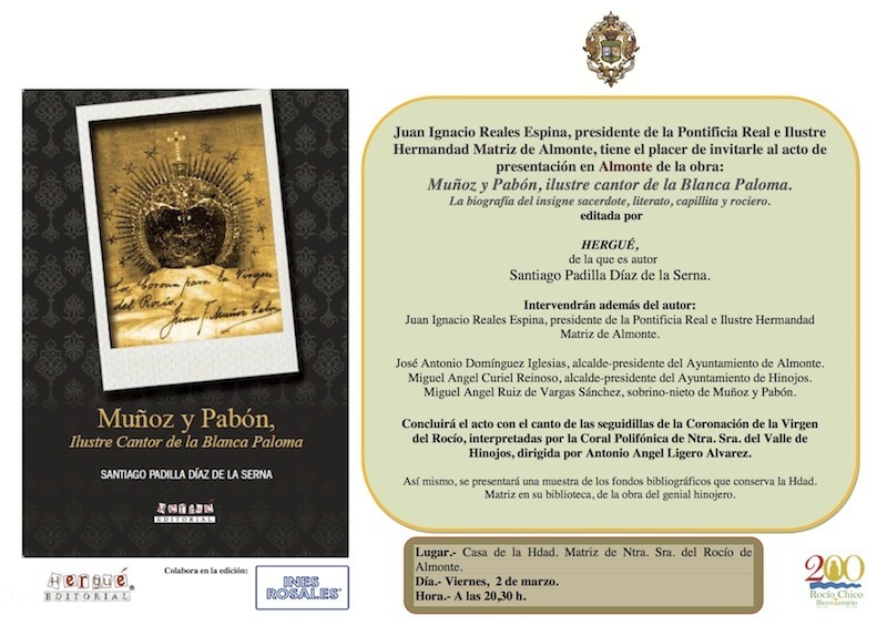 Santiago Padilla, secretario de la Junta Directiva la Hermandad Matriz y con una importante bibliografía sobre temas rocieros publicada, ha escrito la biografía del preclaro hinojero, «Muñoz y Pabón, ilustre cantor de la Blanca Paloma», libro cuya presentación tendrá lugar en la Casa de la Hdad. Matriz de Almonte, a las ocho y media de la tarde del próximo viernes, día 2 de marzo.