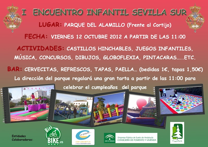 El proximo dia 12 de octubre a partir de las 11:00h en el Parque del Alamillo tendra lugar el primer encuentro infantil de la Hermandad del Rocio de Sevilla Sur, en el se instalaran Castillos inflables y atracciones para los pequeños, actividades como musica,globoflexia,dibujos, pintacaras….. ademas podremos disfrutar de un magnifico anbigu con tapas, bebidas y productos de la tierra.