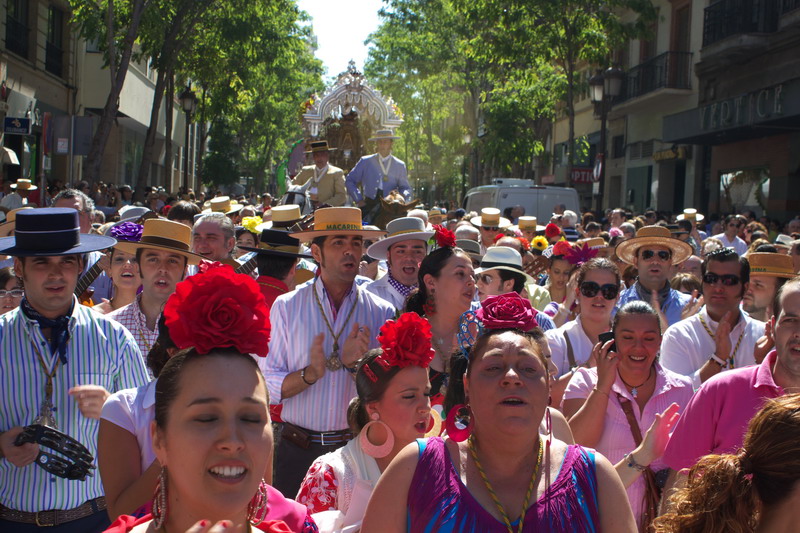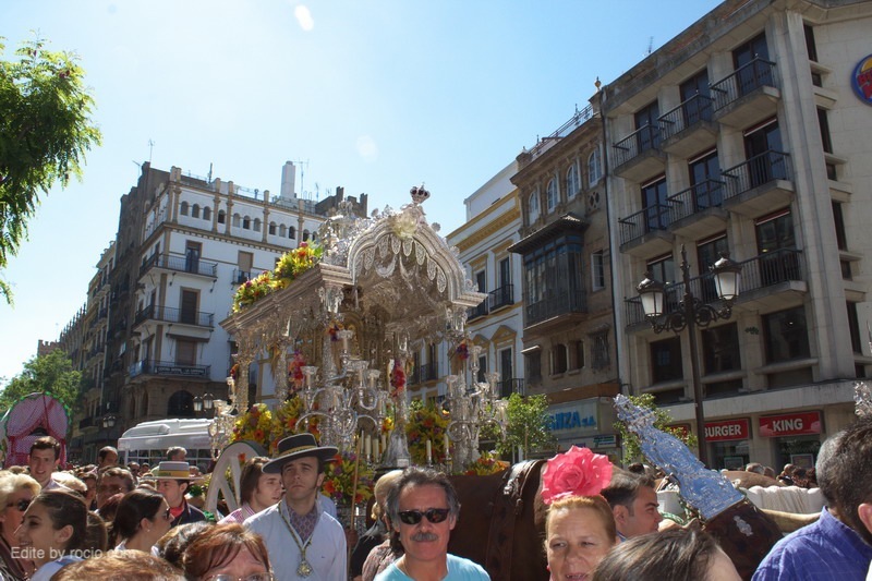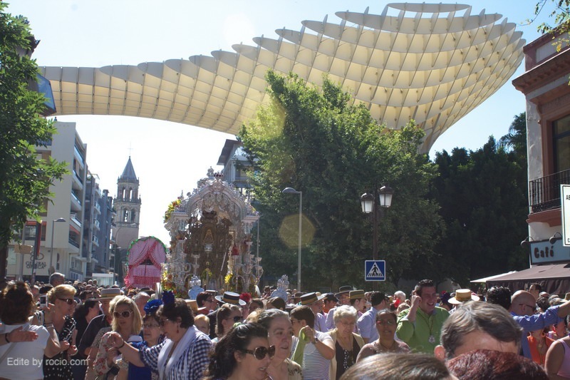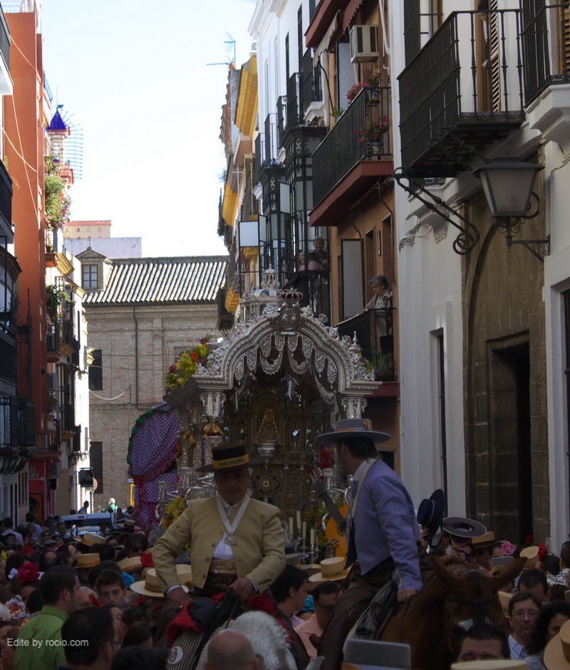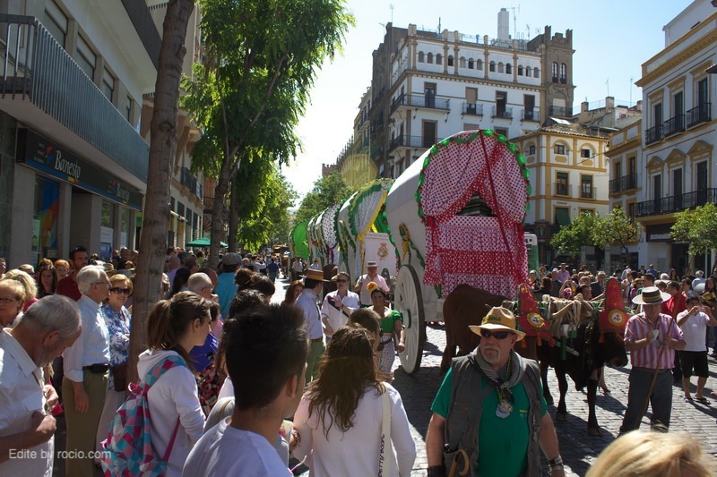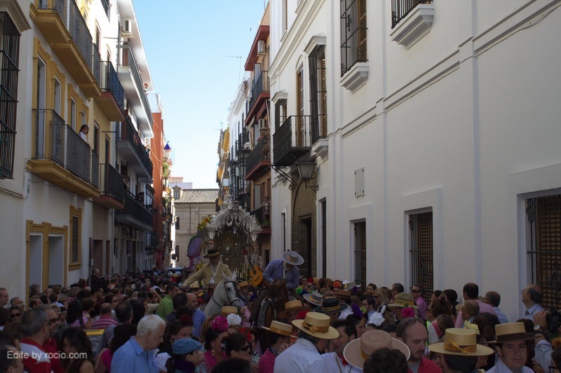 «¡Viva la Blanca Paloma!, ¡Viva la Virgen del Rocío!, ¡Viva la Macarena!», resonaba en las calles. Unos 600 peregrinos se ponían en camino junto a jinetes a caballo, que iniciaban el cortejo, y varias carretas tiradas por bueyes. El Simpecado atravesaba el arco de la Basílica de la Macarena y era conducido hasta la puerta de la misma. A partir de ahí, las lágrimas de algunos se confundían con la alegría de otros al ver a la Esperanza Macarena al fondo (como si despidiera a la hermandad).