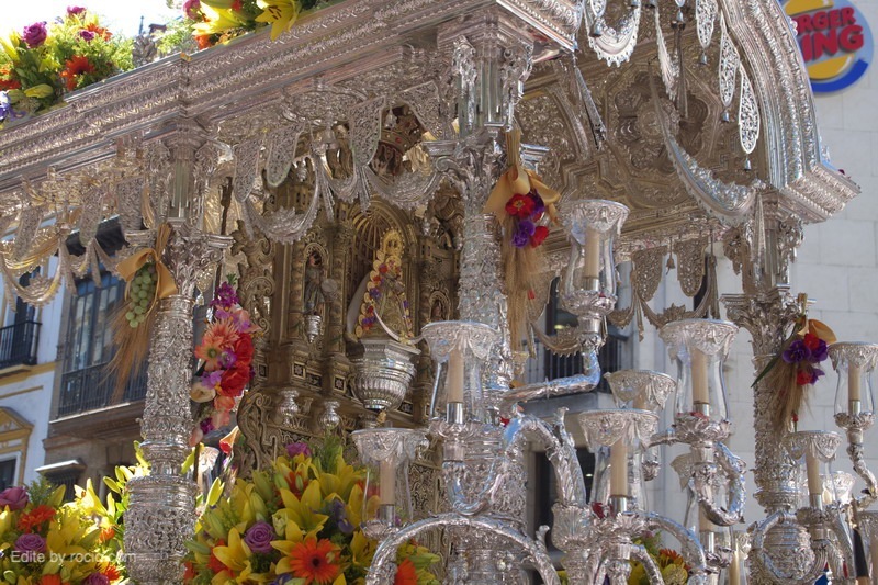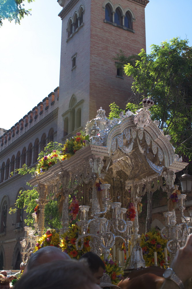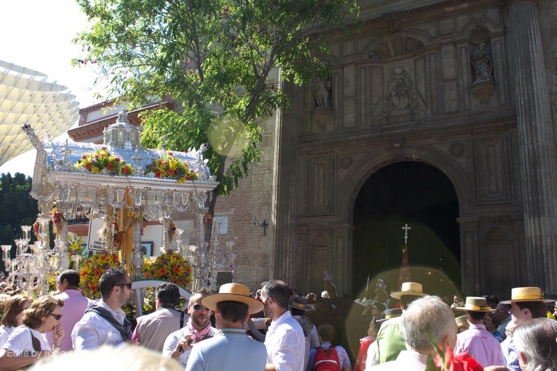 Sentimientos a flor de piel, redoble de campanas y la Hermandad del Rocío de la Macarena plantó su Simpecado en la calle alrededor de las 8:15 horas. Cientos de fieles se agolpaban para verla salir en la recóndita plaza de San Gil. Comenzaban las rumbas, los toques de flauta y tamboril, las sevillanas… todo era poco para contemplar, un año más, a esa bella hermandad que serpenteaba entre las estrechas calles de su barrio.