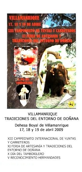 A lo largo de tres días, del 17 al 19 de abril, se celebra en Villamanrique de la Condesa el XIII Campeonato Internacional de Yuntas y Carreteros y la XI Feria de Artesanía y Tradiciones del Entorno de Doñana.