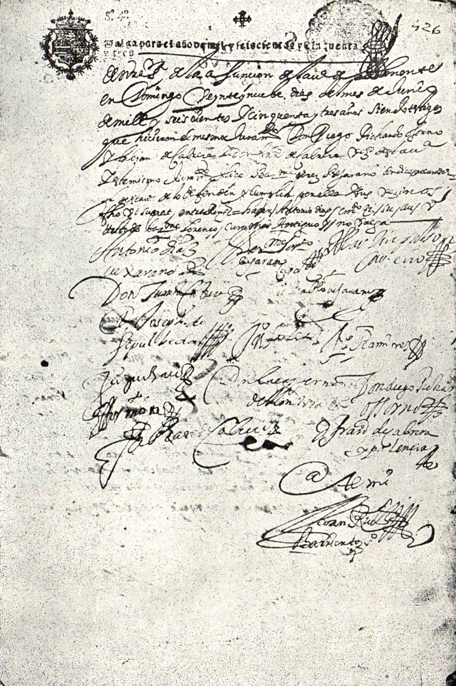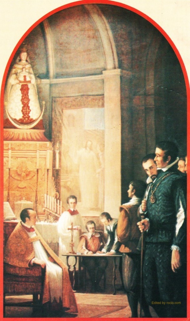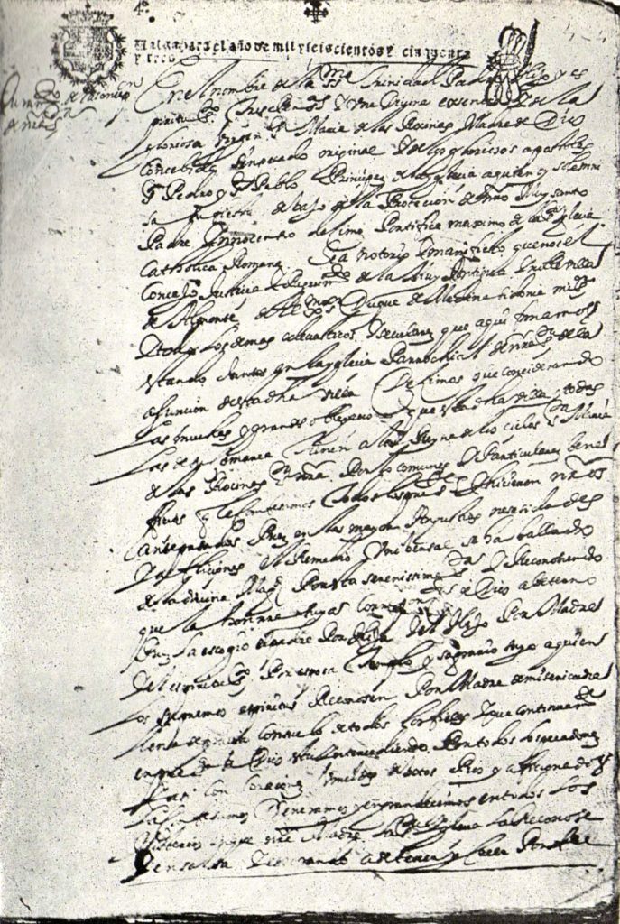 Sea notorio y manifiesto que nos, el Concejo, Justicia y Regimiento de la Muy Antigua y Noble Villa de Almonte, del Excelentísimo señor Duque de Medina Sidonia, mi señor, y de todos los demás eclesiásticos y seculares que aquí firmamos, estando juntos en la iglesia parroquial de Nuestra Señora de la Asunción de esta dicha Villa, decimos: Que considerando las muchas y grandes obligaciones que esta dicha Villa y todas las de su comarca tienen a la Reina de los Ángeles, Santa María de las Rocinas , Señora nuestra, por los comunes y particulares beneficios que le confesamos todos los presentes y hubieron nuestros antepasados, pues en las mayores angustias, necesidades y aflicciones, el remedio universal se ha hallado en la Divina Magestad por esta Serenísima Señora. [… se formula el Voto de defender el misterio de la Inmaculada Concepción ].