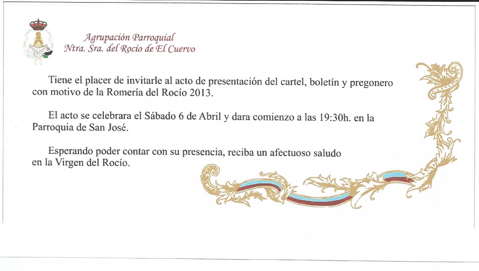Por medio de la presente le remitimos invitacion del acto de presentacion del Cartel, Boletin y Pregonero con motivo d ela Romeria del Rocío 2013 el próximo 6 de abril.