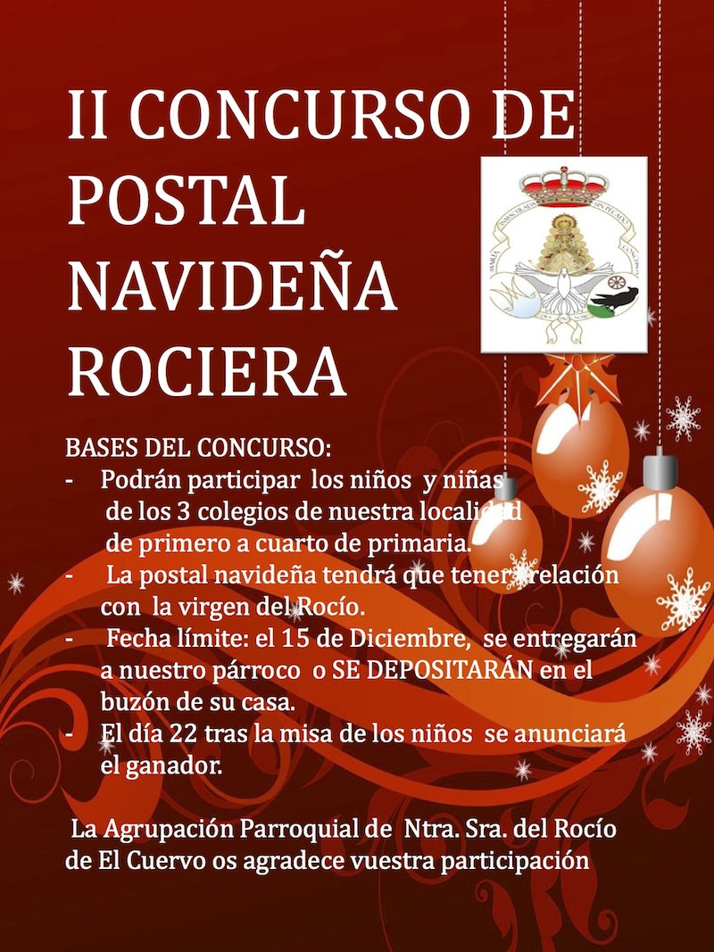 II Concurso de Postal Navideña Rociera, que organiza el Grupo Joven de la Agrupacion Parroquial de Ntra. Sra. del Rocio de El Cuervo, en el cartel que le adjuntamos estan las bases reguladoras de este concurso, para los interesados.